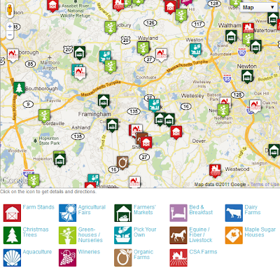 The Department of Massachusetts Agriculture has a nice Massgrown website with a map (see above) to local produce. The site has handy quick links for Farmer's Markets, Dairy Farms, Tourism-Farms, Wine and Cheese, and Pick Your Own.